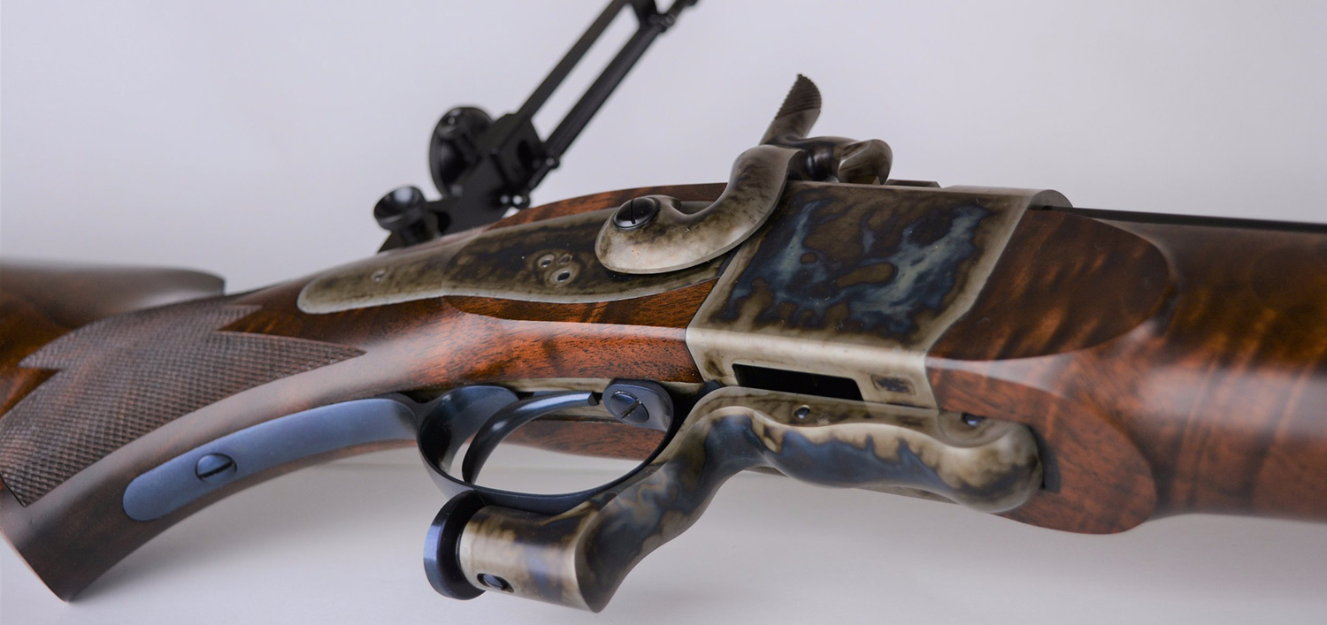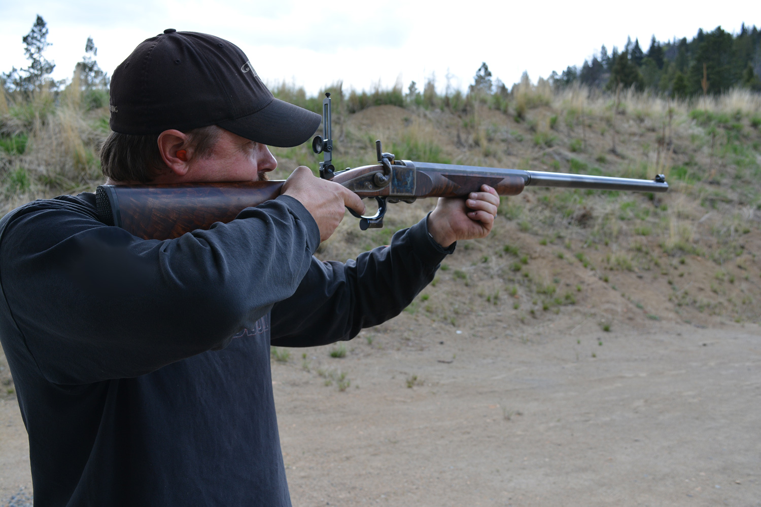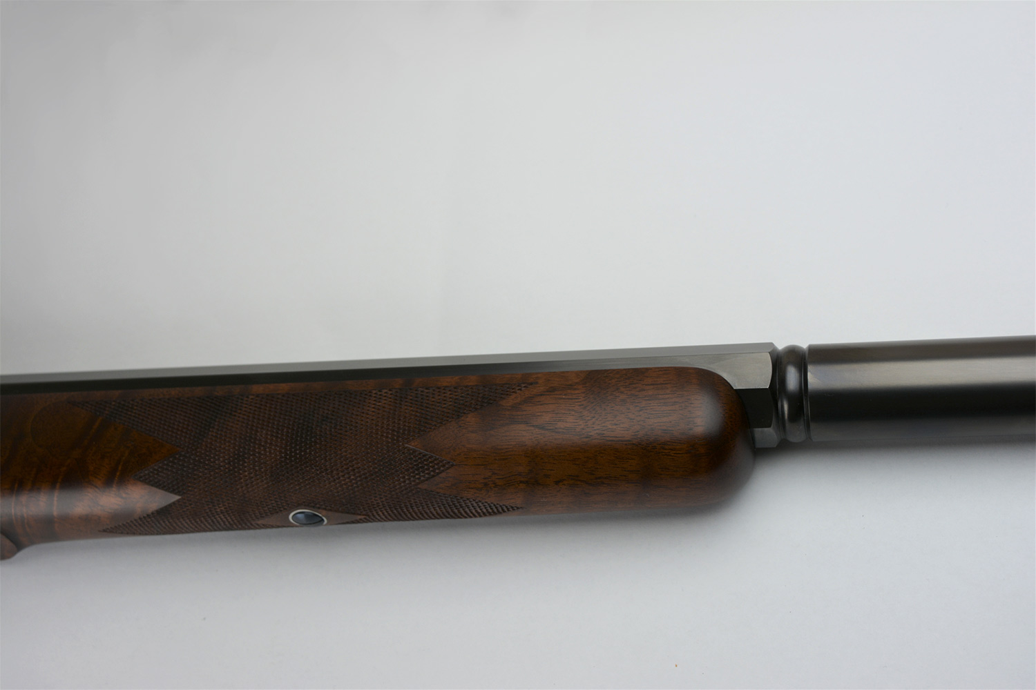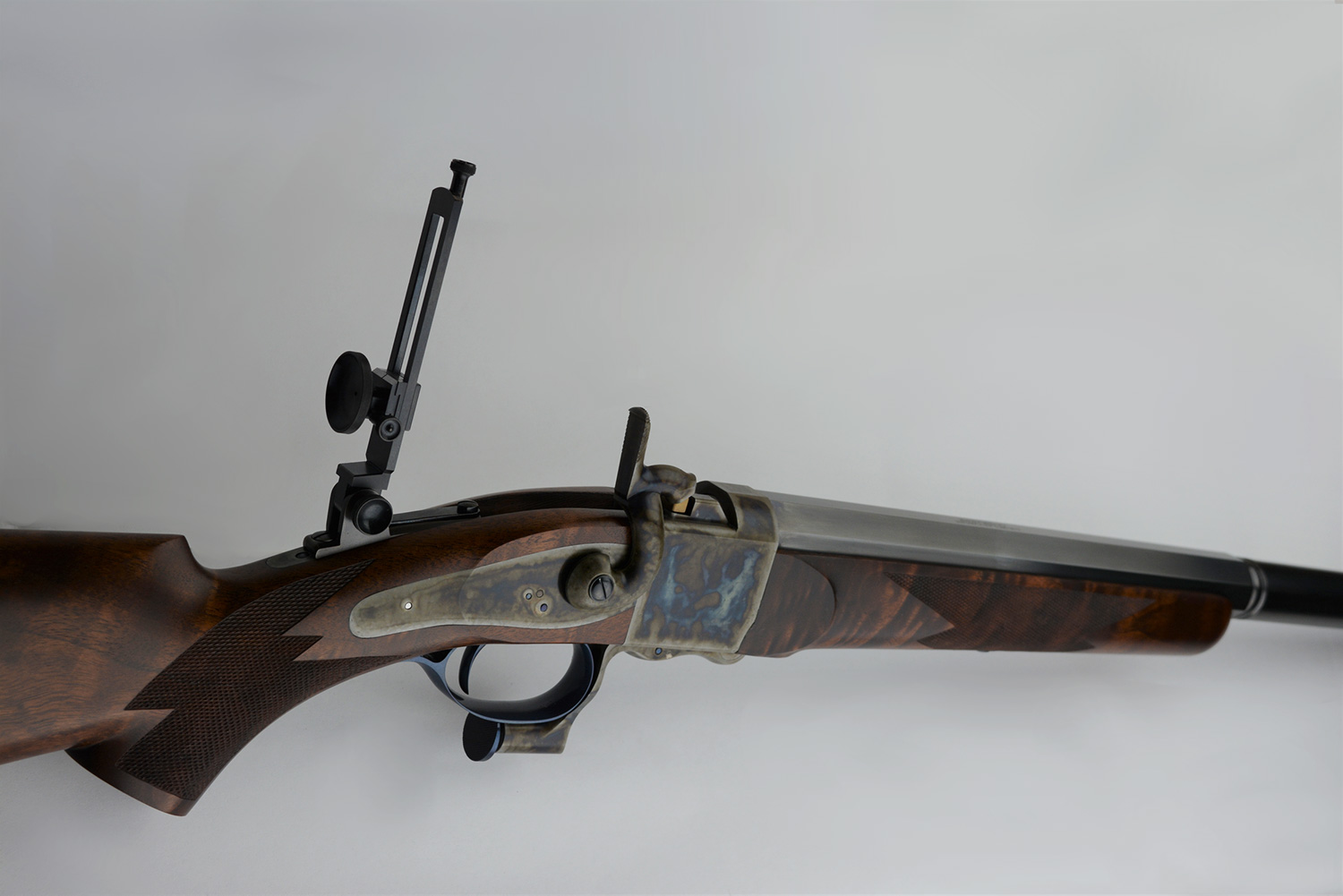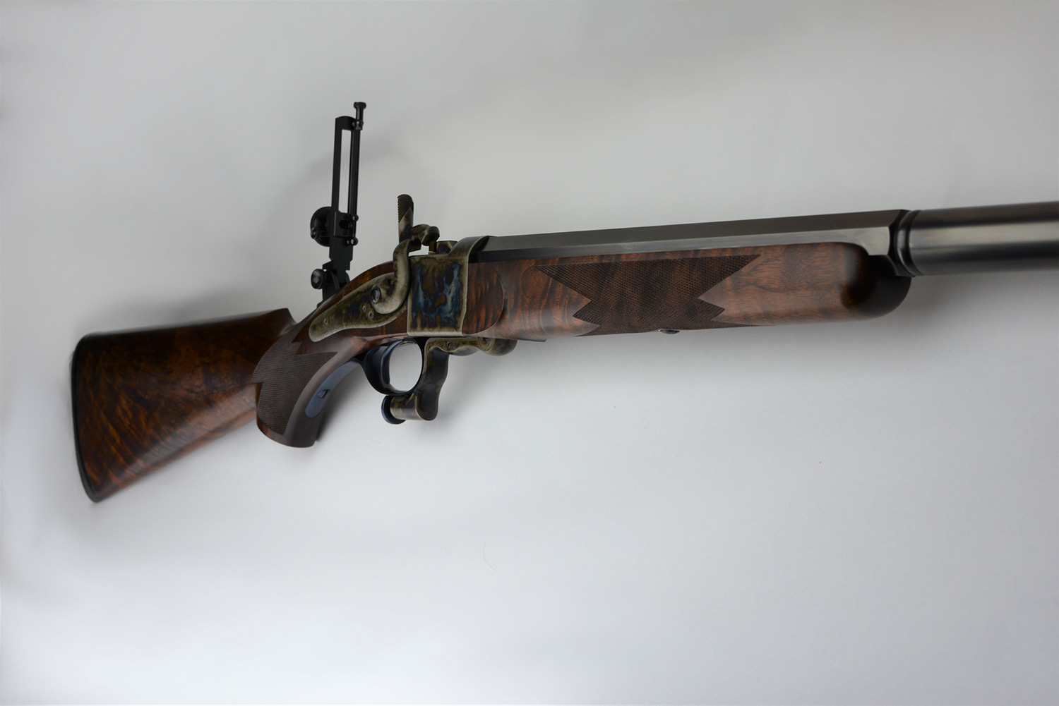 The action on this particular rifle is based on the original Wesson Long Range no.1. It was made for a client experienced in long range shooting, who plans to target shoot and hunt elk in Montana with it. This 45/70 has a 30 inch half-round-half-octagon barrel with a wedding band. We designed a medium weight barrel per customer request. The stock was made to fit, featuring a straight comb with tow-out. The bottom metal, internal parts, and screws are nitre blued. Al Springer of Moore, MT color cased hardened the action and slow-rust blued the barrel. The American black walnut was finished with McLaughlin’s Old World stock oil. Gunmaker, John McLaughlin of Helena, MT.