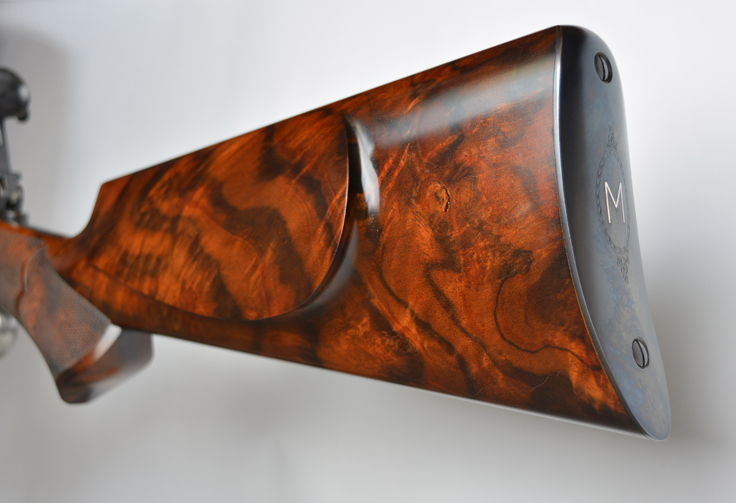 style butt and a solid steel buttplate. The straight comb and 1/8 inch toe out allow the shooter to hold the rifle level without cant. The barrel contours were designed for balance and weight.